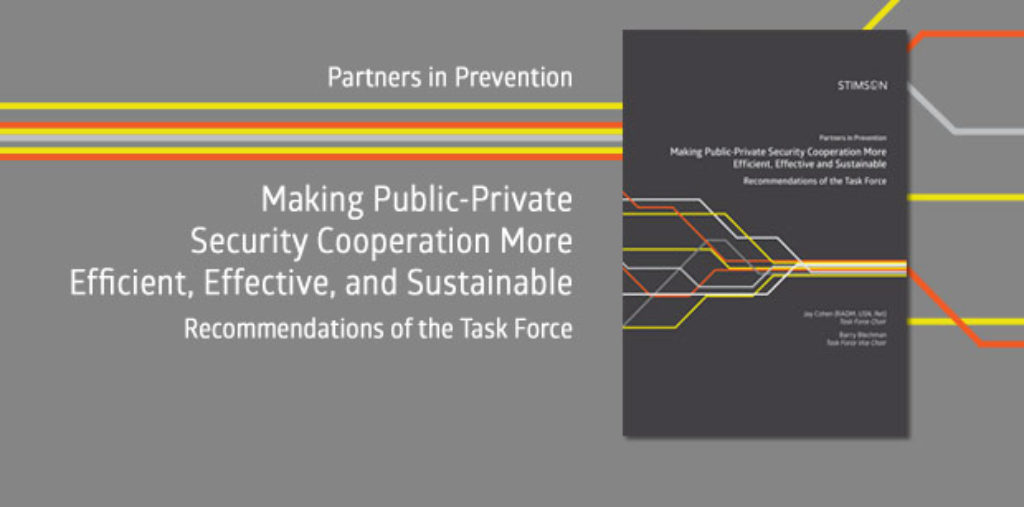 Following over 18 months of collaboration with high-tech manufacturers and service providers, transport and logistics firms, and insurance providers, Stimson’s Partners in Prevention Task Force issued its recommendations to US government and industry stakeholders for targeted, pragmatic steps to partnerships that better serve the interests of both constituencies. The Task Force was chaired by Jay Cohen (RADM, USN, Ret) and included business leaders with senior-level experience at organizations including Allergan, Liberty Mutual, Maersk Line, and the US Council for International Business.