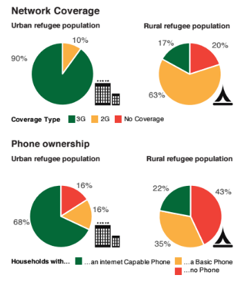 While initial pilot programs showed promise, three common issues emerged: access to mobile technology, reliable network coverage, and reliable internet connectivity. The Connecting Refugees report, acknowledges this limitation in technology and found a large disconnect in the availability of mobile technology and network coverage between urban refugee populations and rural refugee populations, as the graphic below illustrates.