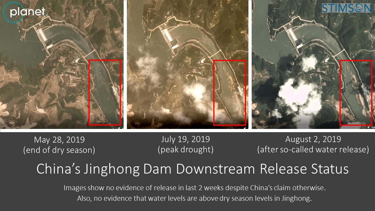 In a rare mano-a-mano with US Secretary of State Mike Pompeo, China’s Foreign Minister Wang Yi claims “China released more water from its dams than usual to mitigate the [Mekong] drought problem downstream” Sorry, Wang Yi, the satellite images suggest the Jinghong Dam has done nothing to relieve drought. Compare downstream images of peak drought on July 19, 2019 and August 2, 2019.