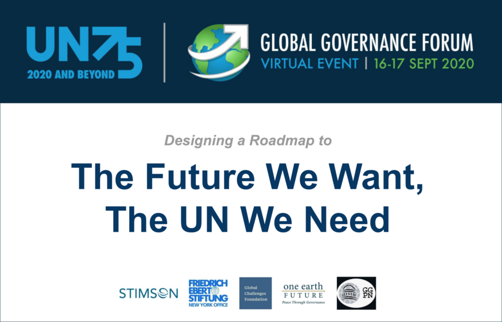 The UN75 Global Governance Forum seeks to promote a more inclusive and effective United Nations through dialogue and recommendations that better harness the ideas, capabilities, and networks of both state and non-state actors for achieving the UN’s commitment to peace, sustainable development, human rights, and a stable climate.