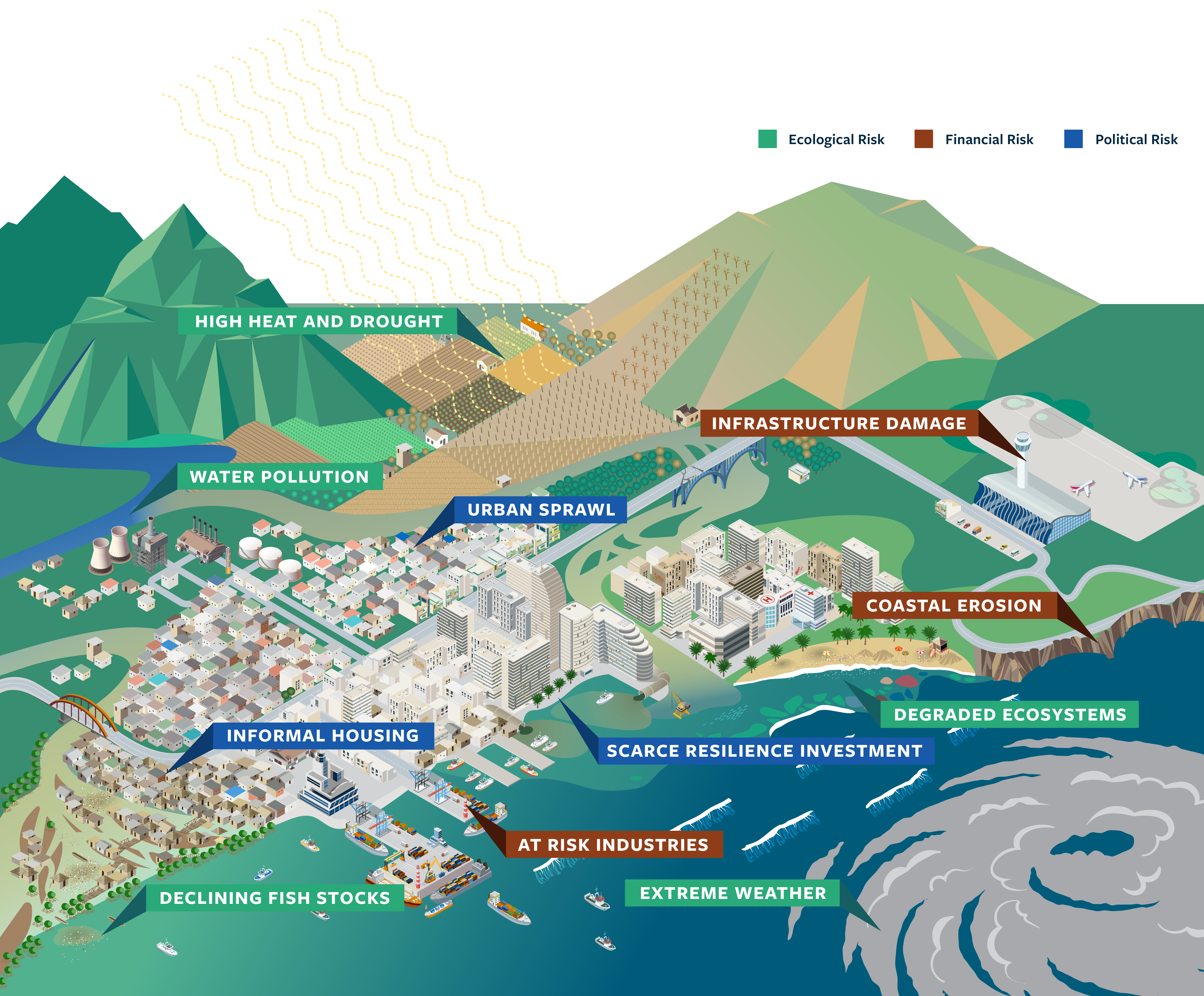 Extreme storms, sea-level rise, and heat waves threaten the future of coastal cities. In addition, coastal cities face risks that originate outside the city limits. Inland, severe droughts threaten agricultural production, resulting in migration towards urban centers. Ocean acidification and warming temperatures degrade ecosystems and fisheries, which are vital to the blue economy of many coastal cities. This risk is compounded by land-based stressors like pollution.