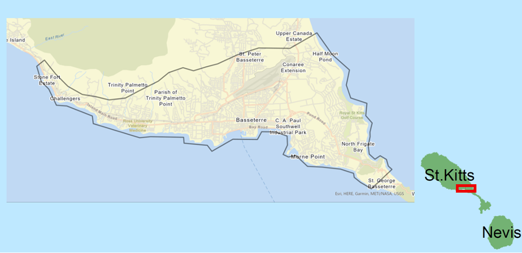 Basseterre, the capital of and largest city in St. Kitts and Nevis, has a population of 14,000 people1Note: Saint Kitts and Nevis-The World Factbook, https://www.cia.gov/the-world-factbook/countries/saint-kitts-and-nevis/#people-and-society, retrieved 2021-09-12. , accounting for approximately 27% of the country’s population. St. Kitts and Nevis is located in the Caribbean at the southern edge of the Atlantic hurricane belt, where tropical cyclones occur from June to November.2Note: OECS, (2021),”Country analysis: resilience to climate change at a glance Saint Kitts and Nevis.” The proportion of the workforce employed in the tourism industry is expected to increase considerably over time, posing considerable challenges to urban planning and the natural environment that are being exacerbated by the impacts of climate change.