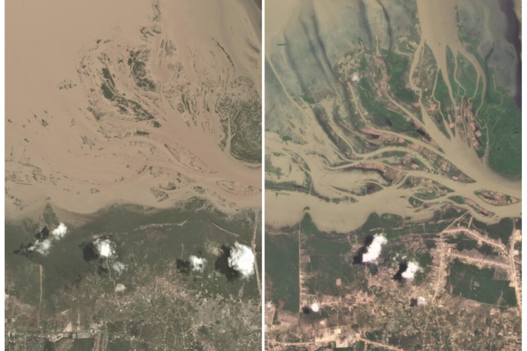 Above: High resolution satellite imagery from Planet Labs compares lake and river levels at the Tonle Sap Bottleneck in Cambodia in mid-August for 2018 and 2021. 2018 was a normal year for wet season flow while 2021 was the 9th lowest flow year on record