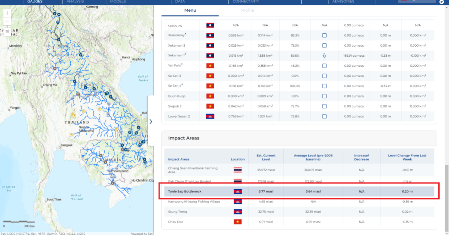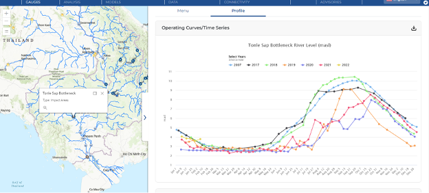 Clicking on the Tonle Sap Bottleneck virtual gauge takes you to its profile page. At the top of the profile we see an Operating Curves/Time Series chart with more information about the current health of the river. The 2022 line ends with the most recent river level estimate of 3.77 meters. Compare the 2021 line to the 2018 line, which looks like a sine wave. 2018 was a typical wet season for the Mekong, with the river rising quickly to high levels May through September and then gradually returning to dry season lows from October through December. This is what the Mekong River and the Tonle Sap have typically done for centuries and which supports the natural bounty of local fisheries. However, in 2021 the river rises later in the year and never gets close to the 2018 peak level before falling again. Similar patterns can be observed in 2020 and 2019. What’s causing the difference? We know 2019-2021 were drier than 2018, and drought will cause a lower peak, but dams are also driving some of that impact. The Mekong Dam Monitor can’t currently determine how much of an impact on the Tonle Sap is from dams.
