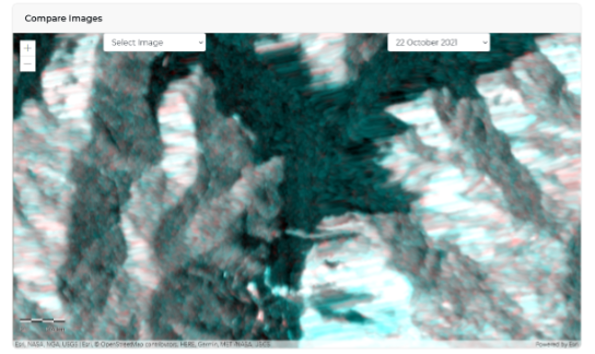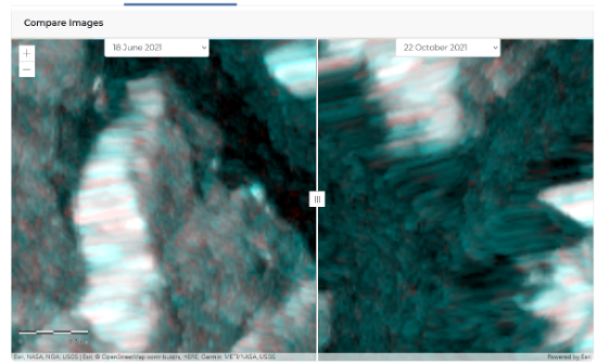- Compare that to the reservoir’s lowest point for 2021 (identified via the time series above) by selecting June 18, 2021 in the left pull down menu. You can compare the images by dragging the slider across. See how much more black (water) area is in the September 16, 2021 image compared to the June 18, 2021 image? The reservoir filled up during this period and restricted an equivalent amount of water from the downstream.