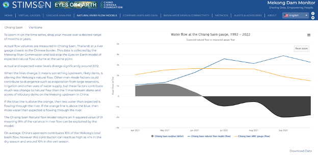 Coming back to September 2021, we can see that the expected natural flow is 1,543 cumecs higher than the actual flow, displayed as a negative number in the surplus/deficit value when you hover over the chart. Why is it negative? Because the water is missing from the river. This answers the question of how much water is currently missing in the Mekong at Chiang Saen. If the surplus/deficit value is instead positive, then there is excess or extra water in the river.