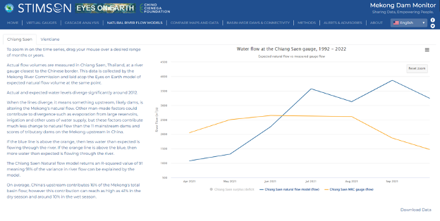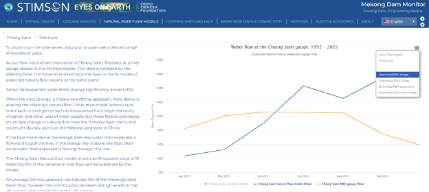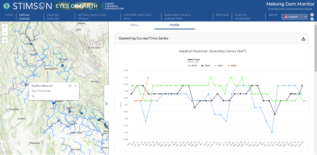 All data provided on the Mekong Dam Monitor is available for download. Look for download buttons on the various displays throughout the online platform. You can also right-click and save any images or maps on the Mekong Dam Monitor for your personal or professional use. We ask that you give us credit by telling your friends that you got this information from the Mekong Dam Monitor. Also, if you publish the information in a report or for a presentation, please cite us as “Stimson Center and Eyes on Earth Mekong Dam Monitor, [your date of access], https://www.stimson.org/project/mekong-dam-monitor/.”