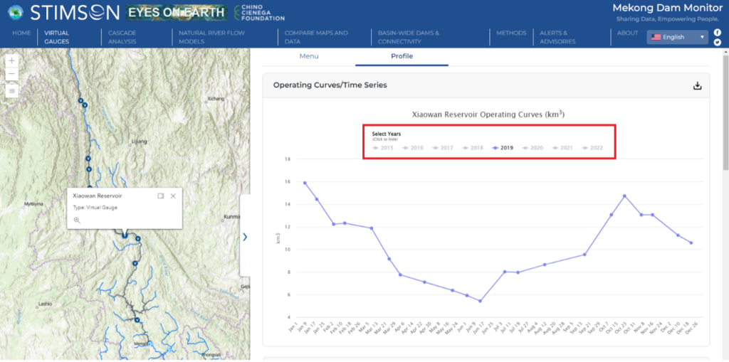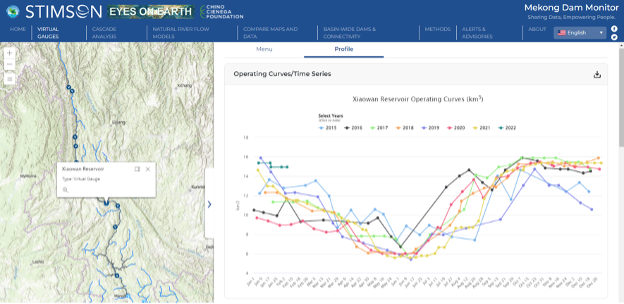 - Click all the years (2015, 2016, 2017, 2018, 2020, 2021, and 2022) to display the operating curves for all years in the dataset. You can see that the Xiaowan Dam follows fairly predictable patterns of releasing all of its usable water (active storage) during the dry season and recharging its reservoir in the wet season. These are the patterns of a seasonal storage dam, which has the greatest effect on reducing natural flow during the wet season and increasing flow during the dry season. These impacts rise for dams with large reservoirs such as Xiaowan and Nuozhadu.