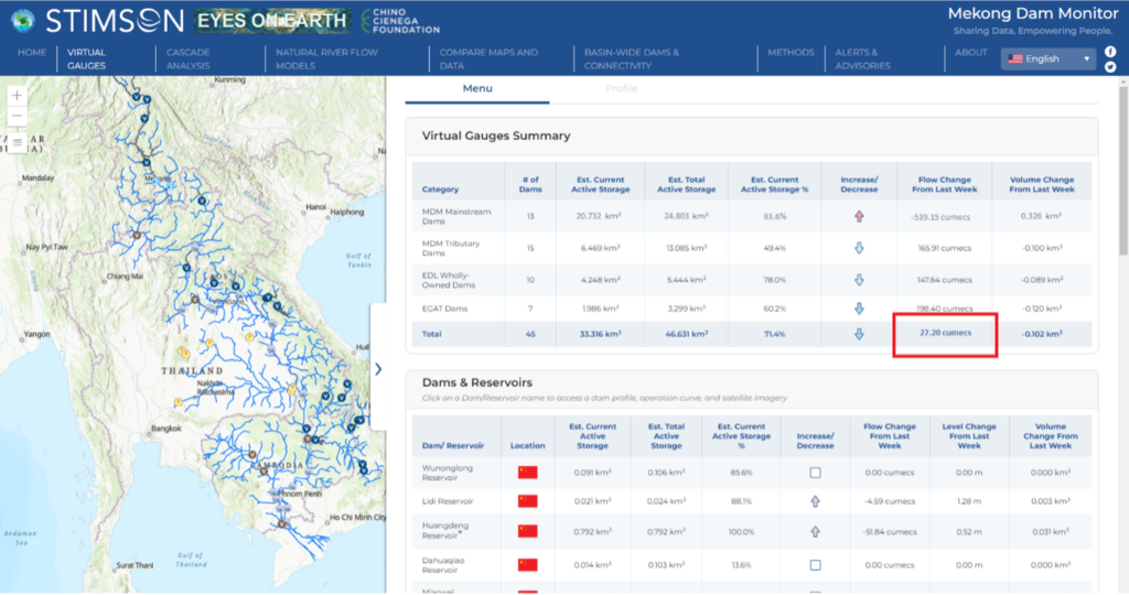 Summary data is available by dam category at the top of the Virtual Gauge Menu, where we can see the total status of active storage in the Mekong Basin and what percentage full the total status is. When the Est. Current Active Storage % number is high, then most seasonal storage dams throughout the basin are full. The Flow Change from Last Week summaries tell us how much flow dams are reducing or adding to the river over the last week. The “Totals” value suggests 27.20 cumecs of flow was removed from the entire basin last week by dams. The effects of this flow reduction will be experienced throughout most in the lower stretches of the river in Cambodia and Vietnam.