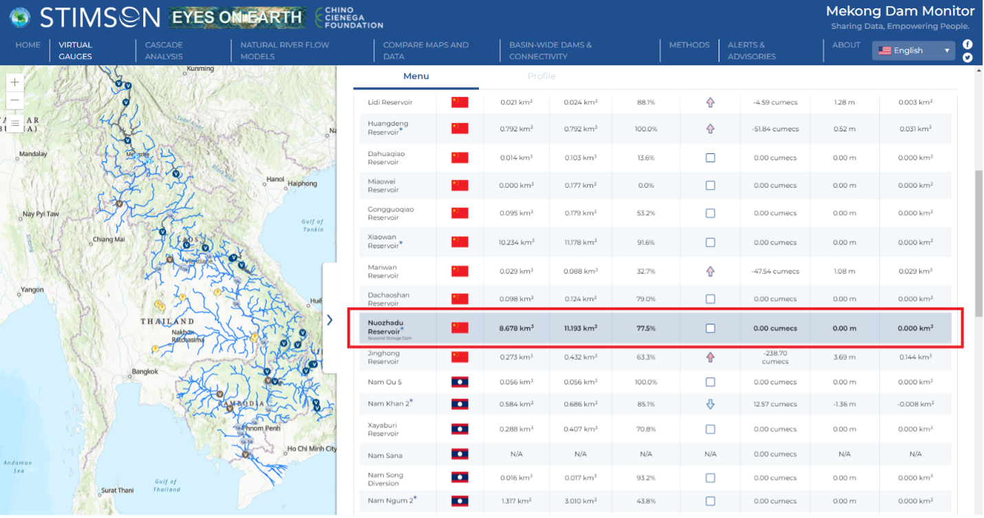 On the main selection menu, select Virtual Gauges and scroll down the page to find the Nuozhadu Reservoir in the list of dams. Here we can see some important information about the current state of the Nuozhadu dam’s reservoir.