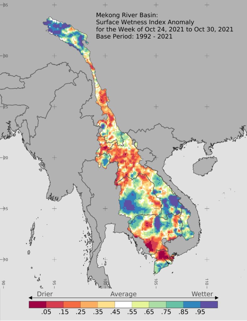 There are extremely wet surface conditions in the headwaters of the Mekong basin. The gorge section in Yunnan was drier than normal, with near-average wetness above the golden triangle. Laos was dry in the north, near average in the center with localized extremely wet surfaces in the southern third of the country. The southern portion of Thailand was extremely wet, while there was a lot of spatial variability further north and east. The 3S Basin and eastern Cambodia had about average wetness, with a lot of spatial variability. The northwestern corner of Cambodia was moderately wet. The center of the country fluctuated between unusually dry and wet, including the area around Tonle Sap lake. The delta region of Cambodia and Vietnam is unusually dry