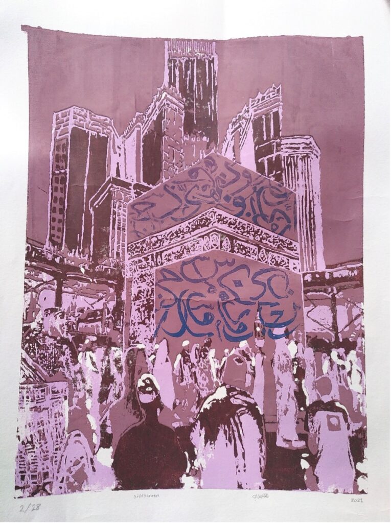 During my trip I purchased an original artwork by Lama Al-Mugbel, a Saudi art student, at a calligraphy exhibition at the Princess Nourah Bint Abdulrahman University. I found that her print combined traditional elements of art, such as calligraphy, with a modern technique. The print shows the Kaaba in Mecca, and to me, it symbolizes somehow a contemporary perception of what Saudi Arabia is, and a projection of the kingdom’s history into the future.