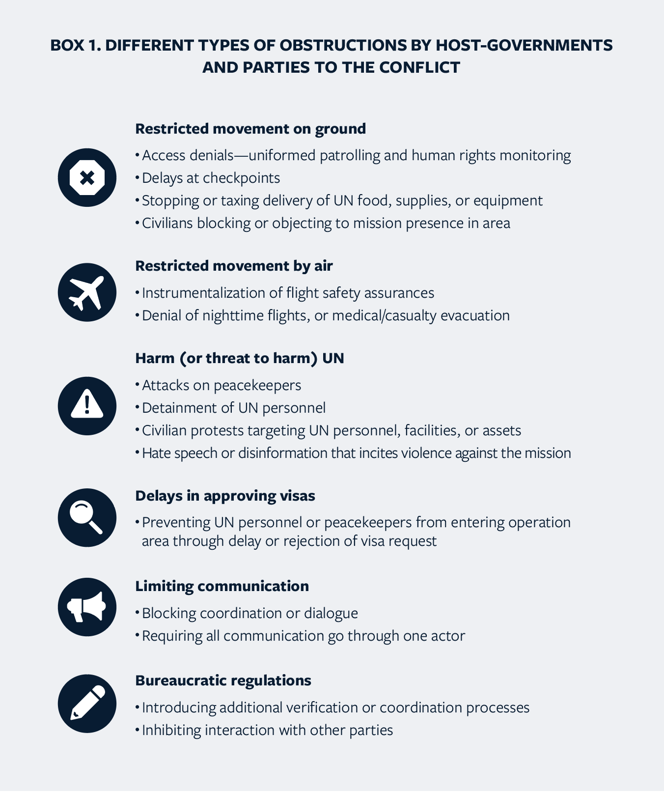 - Establish internal guidance setting out guardrails on the types of obstructions that should be immediately called to the Security Council’s attention, such as through a closed-door briefing or white note.