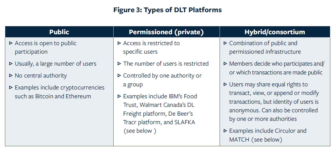 There are three main types of DLT platforms: public, permissioned or private, and hybrid (also known as consortium) (see Figure 3).