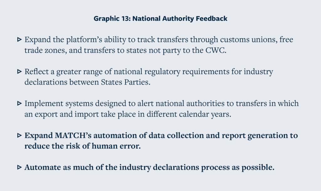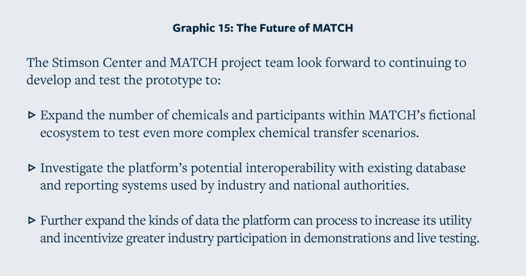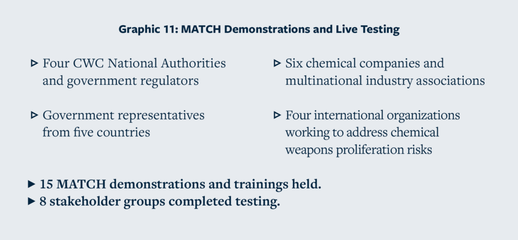 As MATCH continues to develop, feedback from industry, national authorities, and other chemical weapons nonproliferation experts will continue to inform its design and functionality, ensuring that the platform can expand and improve to better address the needs and concerns of these unique stakeholder groups in reducing the risk of chemical weapons proliferation.