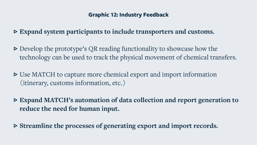 Among industry participants in MATCH demonstrations and testing, a key focus or interest was on the utility of blockchain technology as a tool to enhance, rather than disrupt, the systems that industries already use to track and record data on international chemical transfers. One prominent example from industry feedback was the question of blockchain’s potential interoperability with existing industry databases and reporting systems. With greater interoperability, industry could continue to use their current systems while also benefiting from DLT as an additional layer that complemented their existing databases. MATCH’s API already allows for a great degree of interoperability with other databases, in theory, and this feature could be further developed in future phases of the project. Industry participants also highlighted the importance of increasing the automation of data entry and information-sharing between participants, especially in the case of creating export and import records, to streamline these processes and reduce the overall time and costs associated with data management.