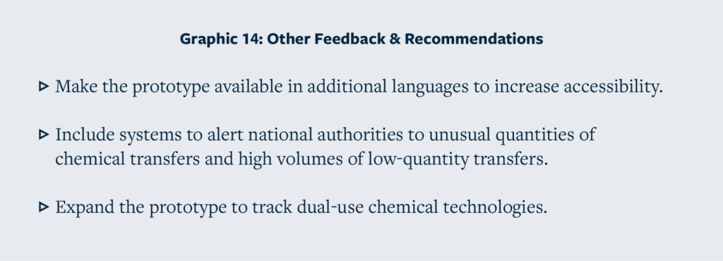 In addition to industry professionals and national authority representatives, the project team also received feedback from representatives of the OPCW, international organizations, and experts on chemical weapons nonproliferation and emerging technologies from among Stimson Center affiliates and nonresident fellows who volunteered to participate in the Blockchain in Practice program’s advisory Blockchain Working Group. During demonstrations and testing, these groups offered several suggestions for improvements and added functionalities for future iterations. Among these was the suggestion to increase the system’s accessibility by implementing additional language options for the user interface, which currently is only available in English and Spanish. Another suggestion was to implement a function that would alert national authorities to transfers of unusual quantities of Schedule 2 and Schedule 3 chemicals, such as numerous small-quantity transfers below the national thresholds for industry reporting, as well as unusually large transfers of Schedule 2 chemicals. Some experts also offered more hypothetical suggestions for future iterations of MATCH, such as the ability to also track international transfers of regulated dual-use chemical technologies, such as chemical aerosolization machines and pill compressors.
