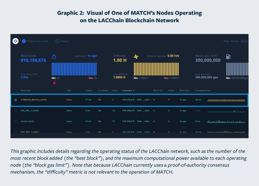 This graphic includes details regarding the operating status of the LACChain network, such as the number of the most recent block added (the “best block”), and the maximum computational power available to each operating node (the “block gas limit”). Note that because LACChain currently uses a proof-of-authority consensus mechanism, the “difficulty” metric is not relevant to the operation of MATCH.