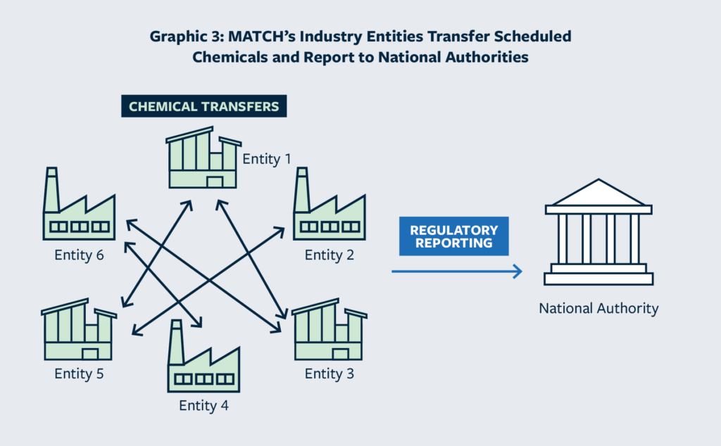 The Stimson Center’s Monitoring and Tracking Chemicals (MATCH) project has developed a proof-of-concept software platform to explore and test the feasibility of using distributed ledger technology (DLT), also known as blockchain technology, to reconcile discrepancies in the international transfer of dual-use chemicals covered under the Chemical Weapons Convention (CWC). The MATCH platform simulates global chemical trade and regulatory reporting using a hypothetical ecosystem based on real-world trade data and national CWC implementing legislation. With development and testing phases completed in spring 2023, the MATCH proof-of-concept demonstrates how DLT can be used to record transfers of dual-use chemicals as they are exported and imported between fictional CWC States Parties, streamlining reporting and reducing discrepancies in chemical transfer records while allowing industry and national authorities to share data using a single, permissioned digital ledger.