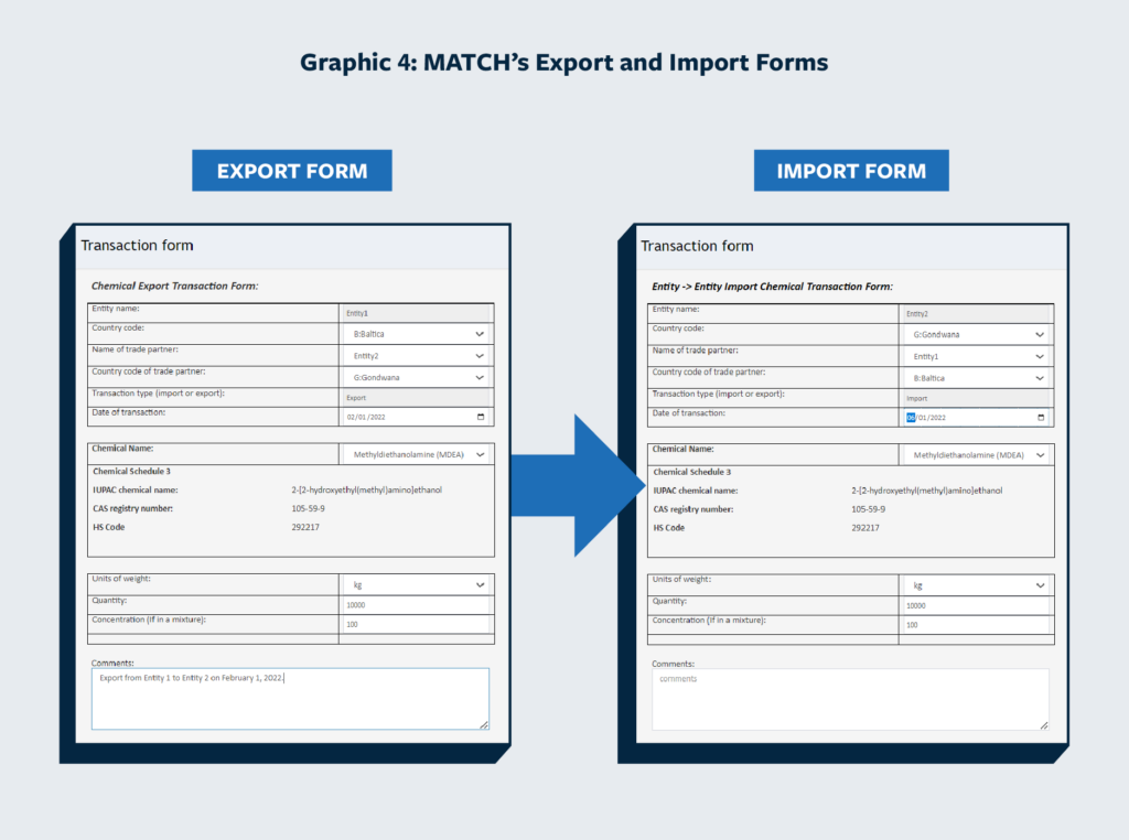 While most testers agreed they could see the potential of MATCH as a tool that could introduce a greater degree of standardization across industry data-sharing and reporting on transfers and significantly reduce the occurrence of many common discrepancies, both industry and national authority testers suggested ways in which the platform could be expanded to include new participants and capture more data on chemical transfers. A popular suggestion was to include the role of transporters (e.g., commercial overseas shipping enterprises, etc.) and to expand the amount of data captured on industry entity export and import forms. For example, by including transporters as a unique type of participant on the MATCH platform, export and import forms could include exact shipping itineraries and even GPS coordinate data for individual chemical consignments. Data shared from transporters could also be used to indicate when a chemical shipment was processed through customs or temporarily stored in a third country before reaching its destination.