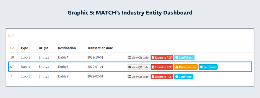 While MATCH simulates declarations requirements for industry and national authorities similar to those outlined in the CWC and in States Parties’ national implementation legislation, the platform also streamlines the process of sharing chemical trade information between industry entities while automating many aspects of the declarations process. In the real world, many transfer discrepancies are discovered only after they have been declared to the OPCW by States Parties who are often unaware of errors and missing declarations that take place at the level of industry reporting. Were industry trade partners to utilize a DLT platform similar to MATCH, discrepancies that occur in industry export and import records could be flagged and addressed before they were included in industry declarations on past transfers to national authorities.