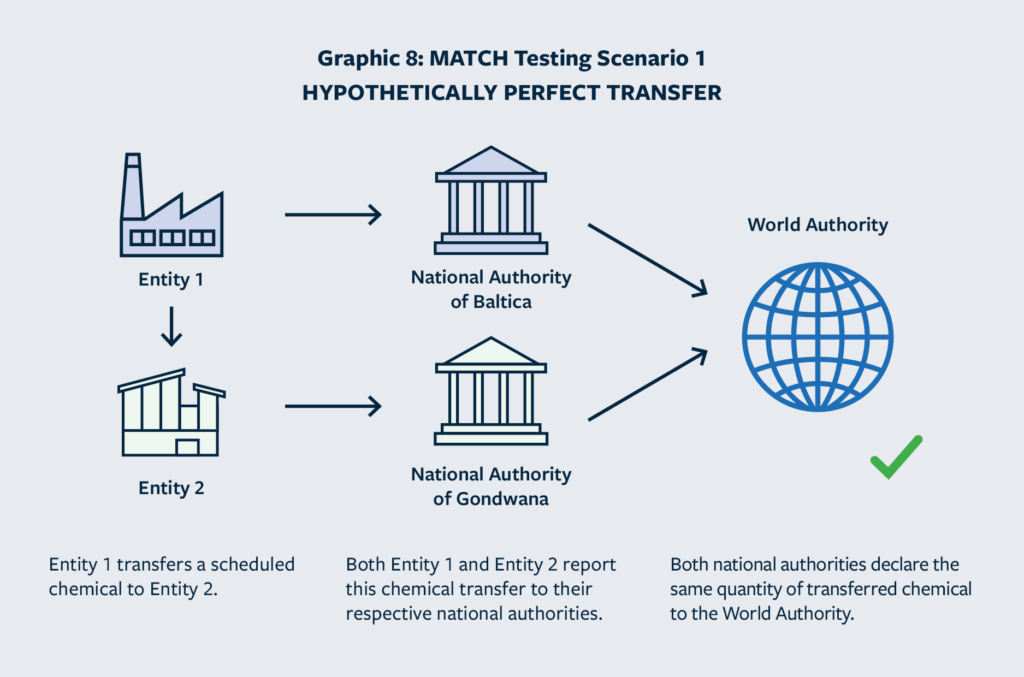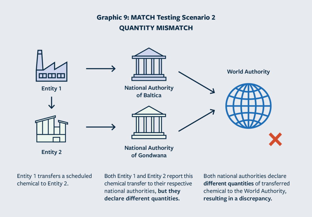 In each scenario, entities hypothetically transferred one or more of MATCH’s four chosen precursor chemicals between two or more fictional States Parties, exchanged records of the transactions, and made reports to national authorities. National authorities in turn made declarations to the World Authority. The scenarios varied in complexity and highlighted several common causes of transfer discrepancies, including calculation errors in industry declarations, misreported chemical quantities or concentrations of scheduled chemicals in mixtures, and missing or mismatched national declarations due to transfers that went unreported by industry or national authorities. The scenarios also simulated the transfer of scheduled chemicals through free trade zones and customs unions, and transfers in which a consignment was exported in one year and imported in another, both common examples of real-world trade that can result in missing or incomplete national declarations.