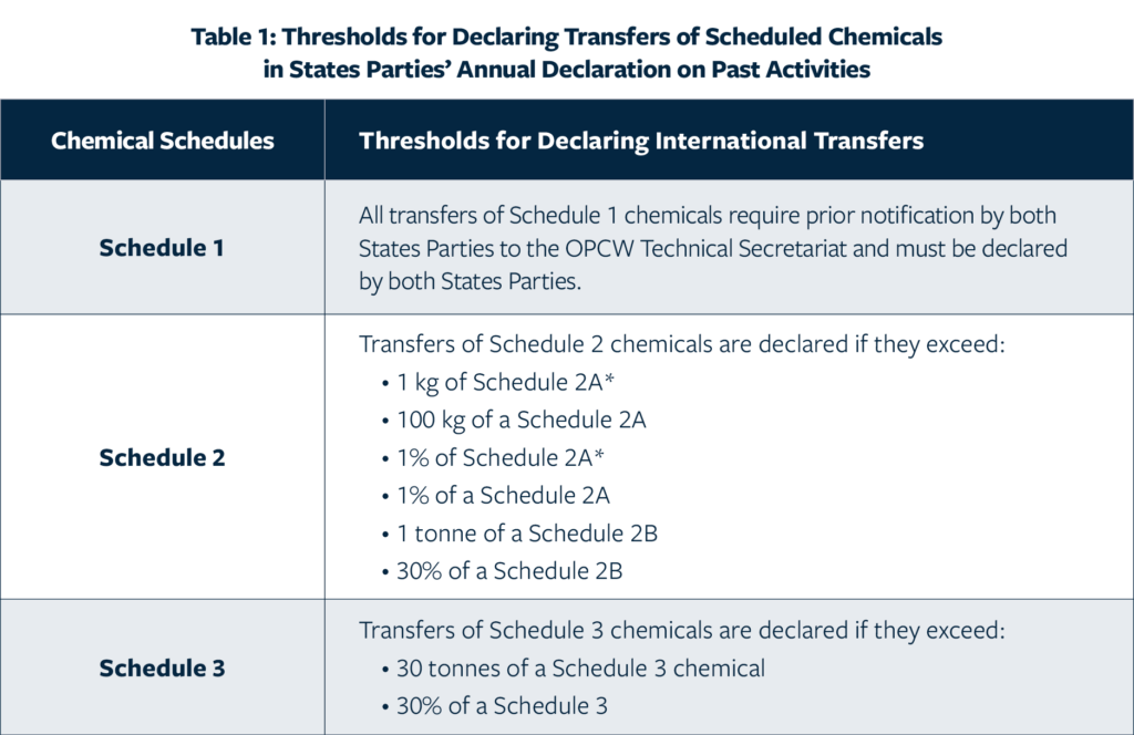 Note: OCPW, “Declaration Requirements for Scheduled Chemicals,” 2023, https://www.opcw.org/resources/declarations/declaration-requirements-scheduled-chemicals. Accessed 1 May 2023.