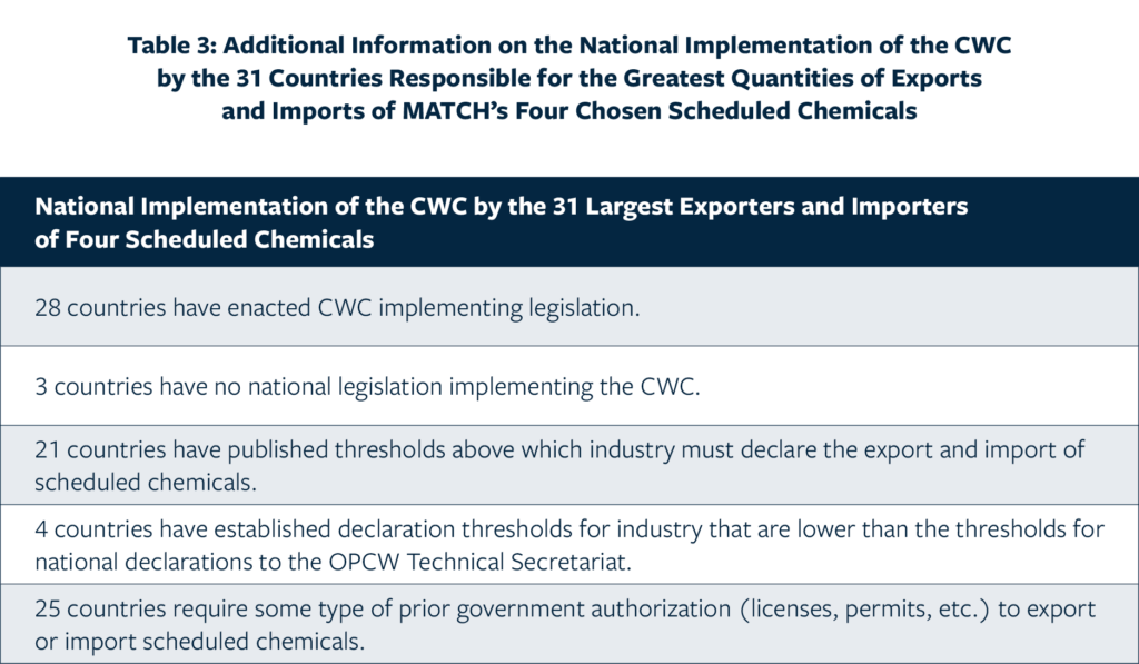 From the U.N. Comtrade data, the project team identified 31 countries whose exports and imports of these chemicals represented the greatest overall trade values and quantities transferred between 2017 and 2020.11Note: These countries were Austria, Belgium, Canada, China, Estonia, France, Germany, India, Indonesia, Iran, Ireland, Italy, Japan, Kuwait, Malaysia, Namibia, Netherlands, Poland, the Republic of Korea, the Russian Federation, Singapore, South Africa, Spain, Sweden, Switzerland, Thailand, the Republic of Türkiye, the United Arab Emirates, the United Kingdom, the United States, and Uzbekistan. The team also performed a detailed analysis of the relationship of each of these countries to the CWC and examined the status of each country’s national CWC-implementing legislation (or lack thereof). Of the 31 countries, three were determined to have no current national legislation implementing their obligations as States Parties to the CWC. The team also determined that the implementing legislation adopted by the remaining 28 countries varied significantly. For example, only 21 of the 31 countries had clearly established industry reporting thresholds above which national industries were required to declare imports and exports of scheduled chemicals. Of these 21 countries, a majority required declaration at thresholds identical to those stipulated in the CWC for annual declarations by national authorities, while four had implemented lower thresholds for industry declarations. A key takeaway from the project team’s research was the general lack of standardization of regulatory and declarations requirements for chemical industry across different countries.