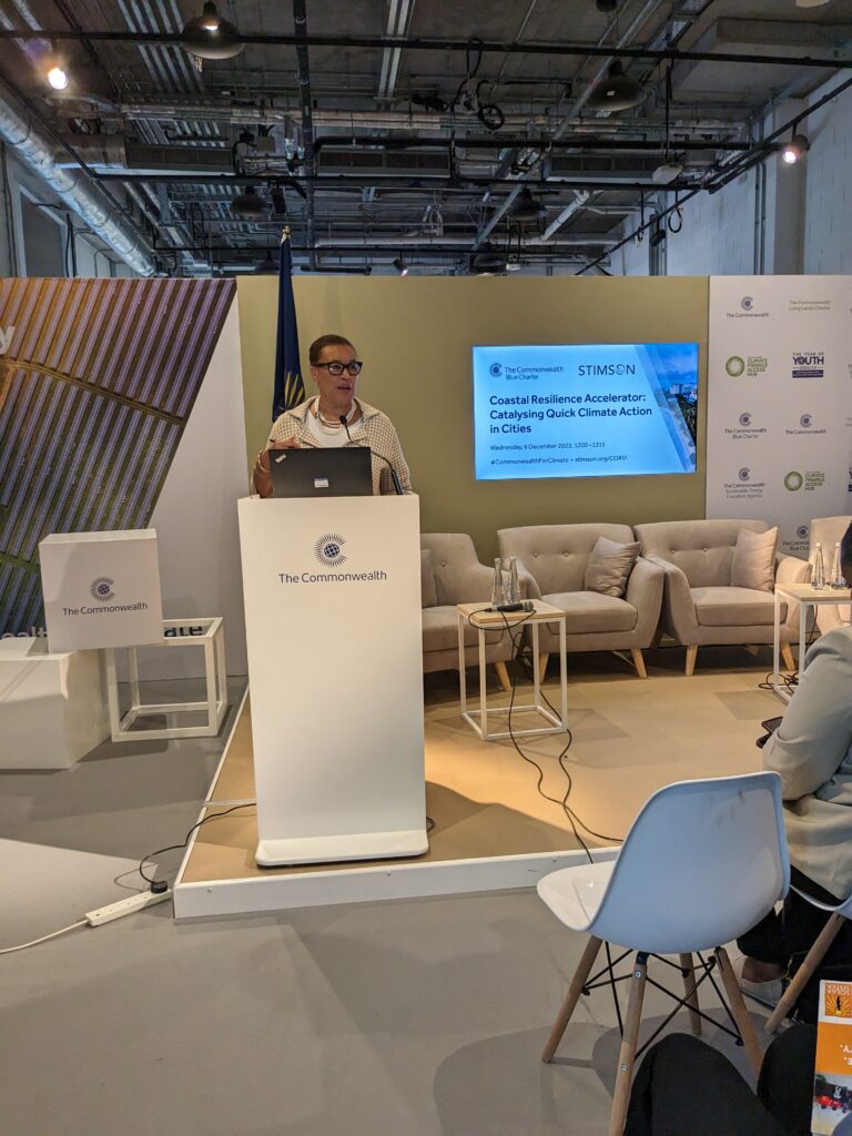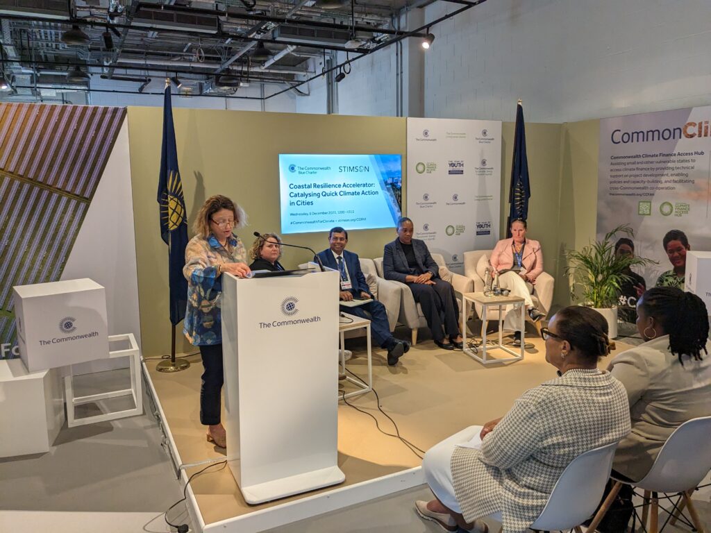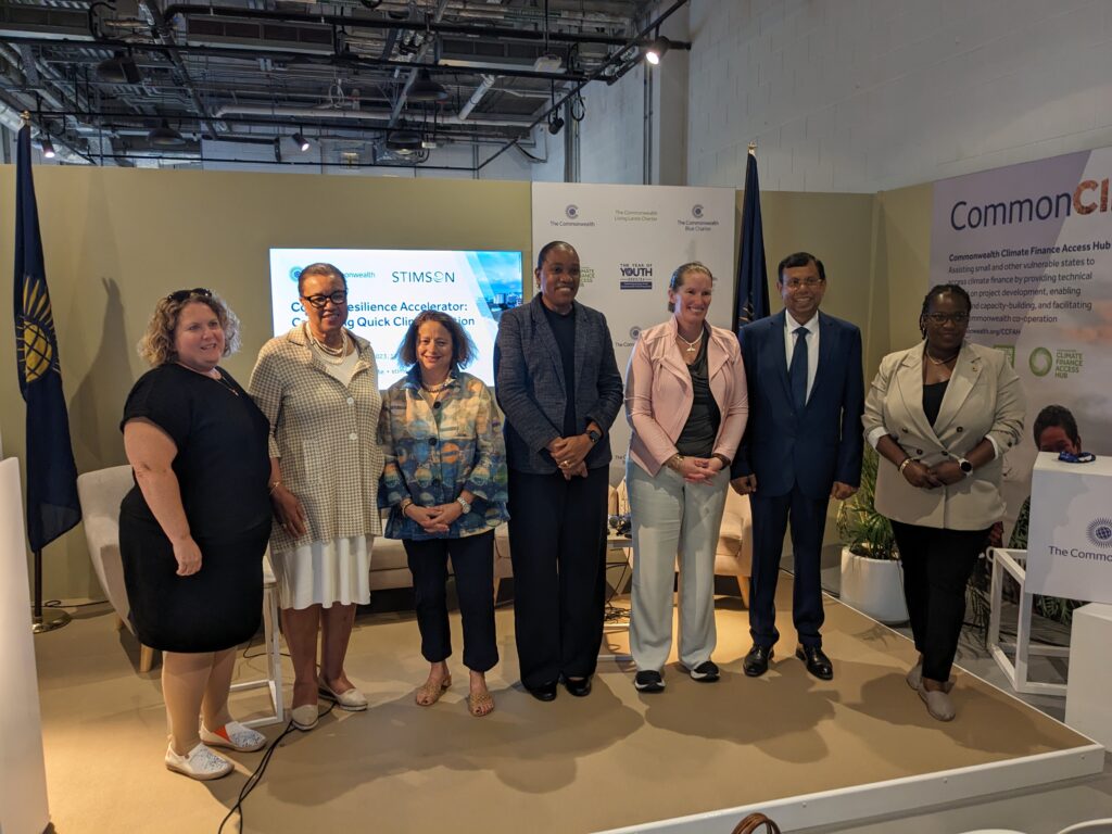 Building on this announcement Environmental Security Director Sally Yozell participated in four official side events with ministers, policymakers, scientists, and practitioners from the US government, the Global South, and the Commonwealth, including the Secretary General of the Commonwealth, the RT. Hon. Patricia Scotland. She spoke about the need for an integrated approach to building coastal climate resilience, the value of local data and information, and regional cooperation to enhance climate resilient fisheries. Drawing on several of our recent full and rapid CORVI assessments where Stimson is working with sixteen island states and cities to deliver climate risk assessments, discussions highlighted how governments need detailed localized data and information to take the next steps to bridge the finance gap and access badly needed capital from the likes of the Loss and Damage Fund, the Green Climate Fund, the Global Environmental Facility, as well as other public and private financial streams.