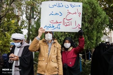 A protest in Qom, where seminary students are asking Iranian military authorities to explain why “severe revenge” was not carried out after the assassination of Fakhrizadeh.