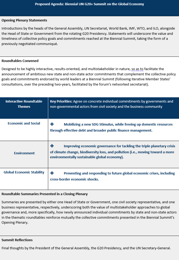 This enhanced language will allow for the formation of a Biennial UN-G20+ Summit on the Global Economy that is more politically robust, by likely securing higher-level participation if convened in connection with the General Assembly’s High-Level Week meeting in September in New York (rather than in connection with ECOSOC’s calendar). Moreover, meeting mainly virtually on a regular basis in executing its duties, the proposed networked secretariat will work to ensure accountability of decisions reached and serve as a knowledge center to collect, validate, and push out collective analysis across the international system between the summits (see further details below on these two central functions).