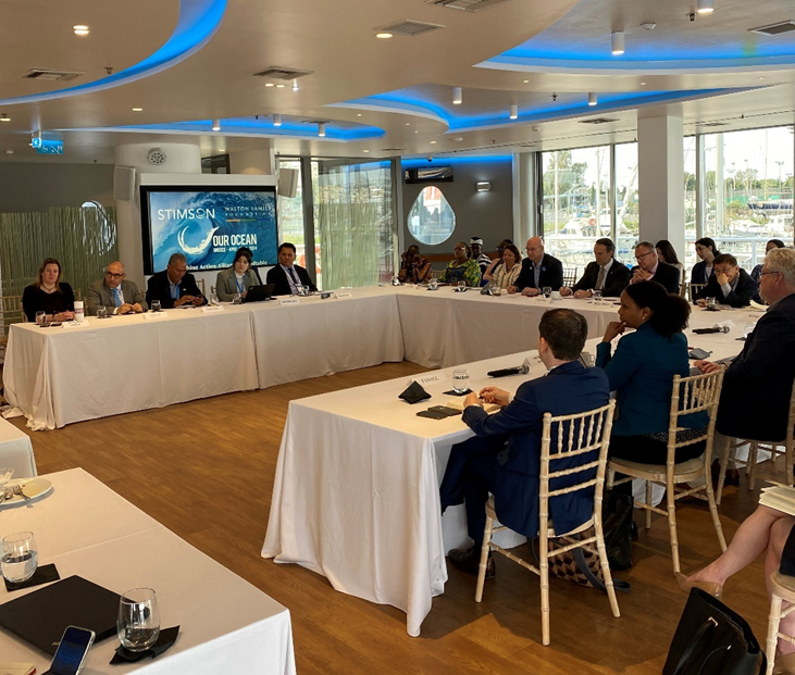Collaboration between governments and civil society is also key to fighting illegal, unreported, and unregulated (IUU) fishing around the world. On the morning of the third day of OOC, Stimson hosted a meeting, alongside the Walton Family Foundation, at a beautiful waterfront venue overlooking the Saronic Gulf that brought together representatives from ten governments and 14 NGO supporters of the IUU Fishing Action Alliance. The United Kingdom reflected on the Action Alliance’s achievements to date, including the development of the IUU pledge and monitoring, control, and surveillance initiatives, and then handed the chairmanship of the Alliance over to Canada. Looking forward, Canada outlined three focus areas of their chairmanship: governance, enforcement, and partnerships. The Alliance also welcomed new members, such as Ghana, and discussed how collaborative action can help protect food and economic security, helping to fight hunger and poverty in the Global South. The Republic of South Korea who joined the IUU Fishing Action Alliance last year noted that as the host for the tenth OOC, they hope to increase the number of IUUF AA members and include capacity building for developing countries as a priority for those who want to join.