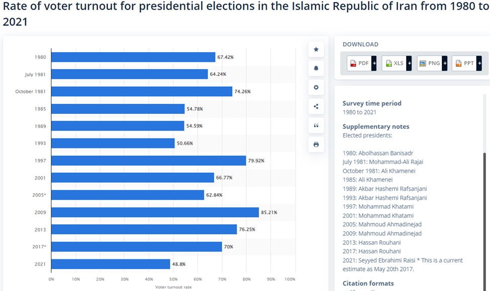 Caption: Rate of voter turnout for presidential elections in the Islamic Republic of Iran from 1980 to 2021. Source: Statista