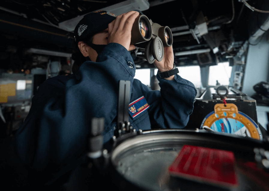 Header image: Ens. Chunchun Waskin scans the horizon on the bridge of guided-missile destroyer USS Barry (DDG 52) during routine underway operations. Photo credit: U.S. Navy photo by Mass Communications Specialist Molly Crawford via DVIDS; Public Domain.