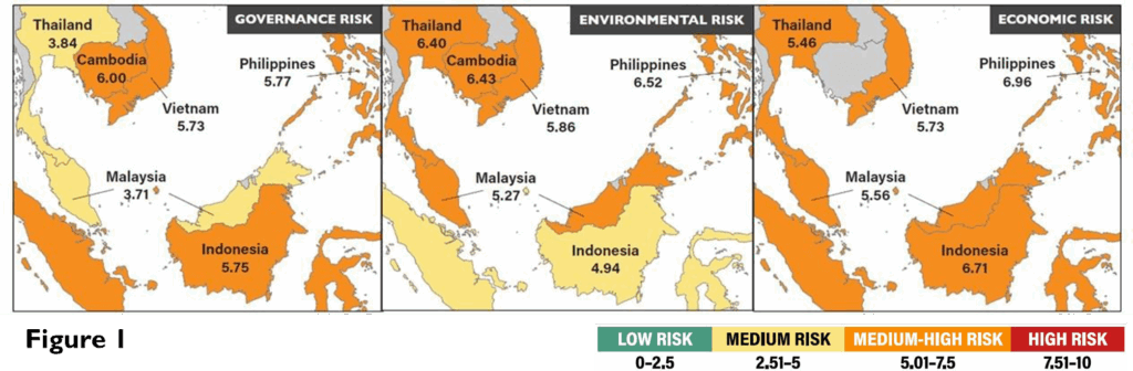 The average score of risk indicators related to governance (Figure 2) suggests medium-high risk in Cambodia (6.00), Philippines (5.77), Indonesia (5.75), and Vietnam (5.73) and medium risk in Thailand (3.84) and Malaysia (3.71). When comparing these two groups, countries with higher per capita GDPs (Thailand and Malaysia) have lower governance risk, reflecting larger fiscal capabilities to address regulatory needs and smaller artisanal fishing populations to manage.