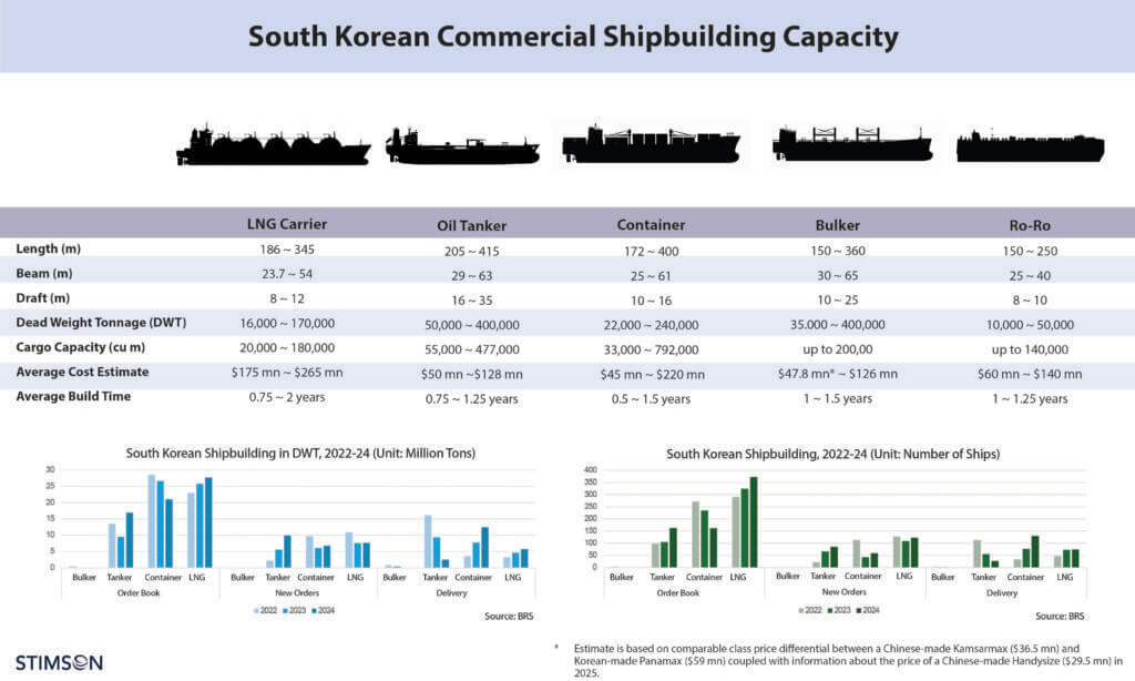 The draw for South Korean shipyards is their ability to incorporate advanced technologies and streamlined workflows to deliver state-of-the-art ships at cost and on time. An Aloha class 3,600 twenty-foot-equivalent-unit (TEU) container ship built in Philadelphia, for instance, costs about $334.5 million. In contrast, an ultra-large container vessel (ULCV) at 24,000 TEU is priced at $272 million if built in South Korea. That is, a ship over six times the carrying capacity is $61.5 million cheaper if built in South Korea. Certain ships, such as LNG carriers, were last launched from U.S. shipyards in 1980, whereas they are the preferred order of choice for builders in South Korea.
