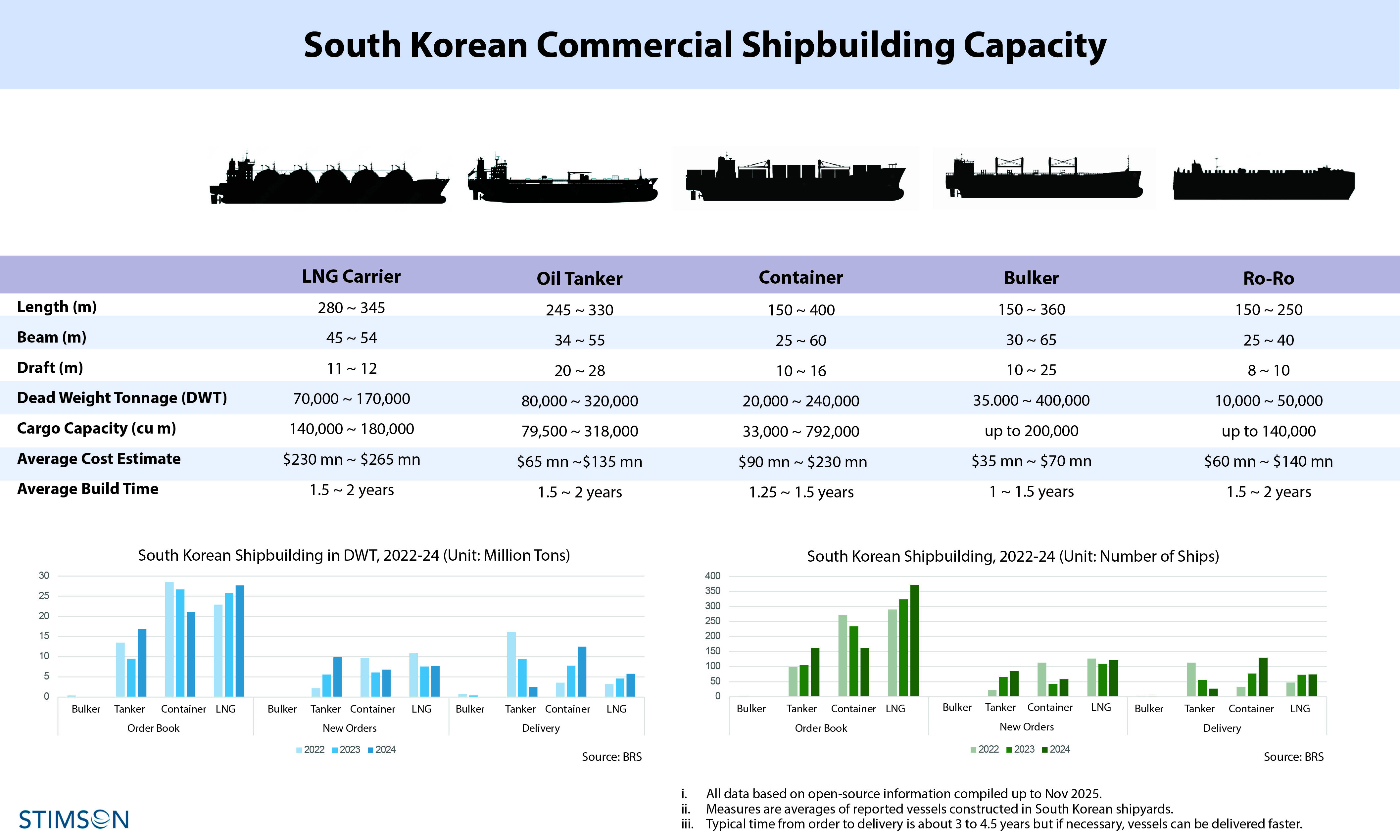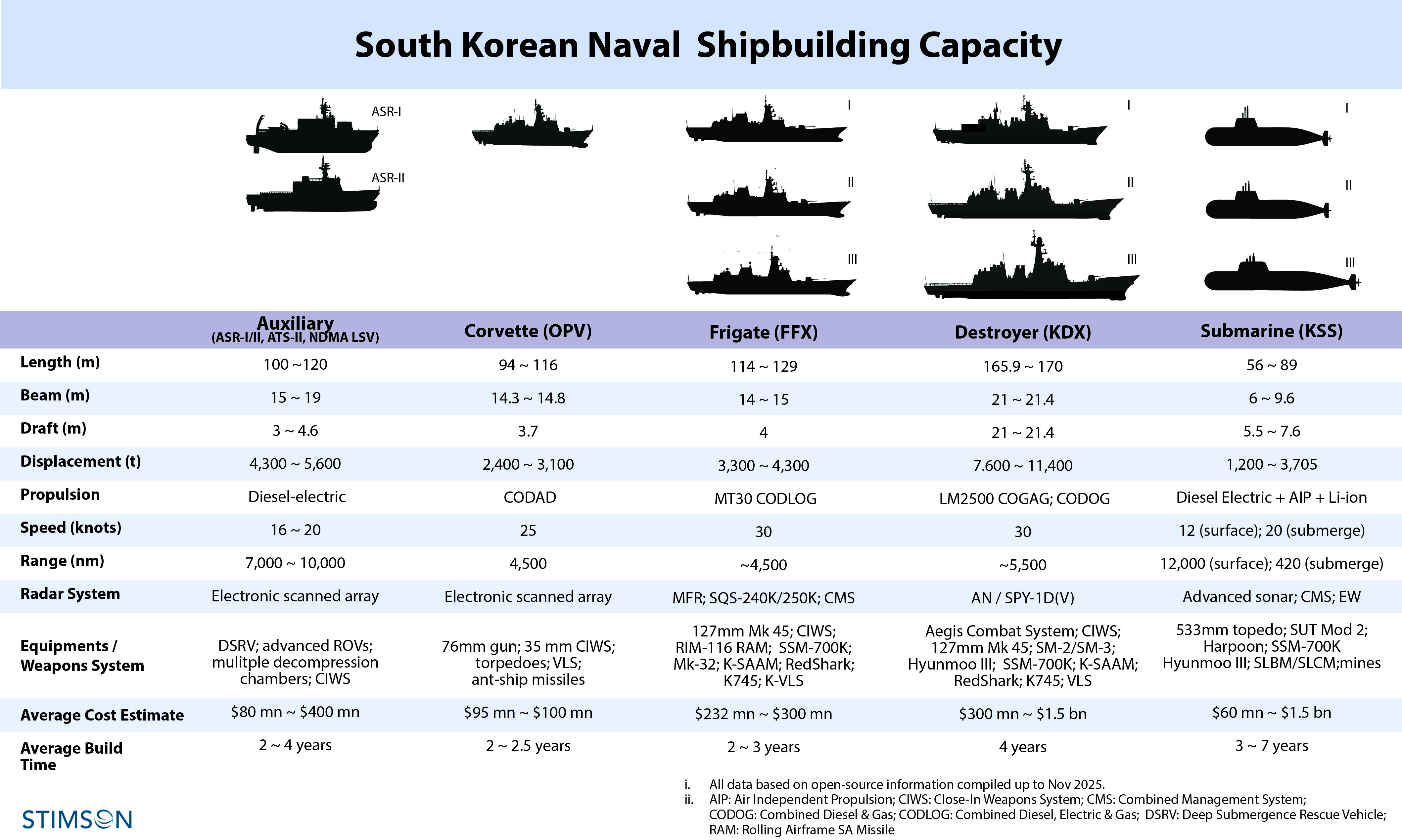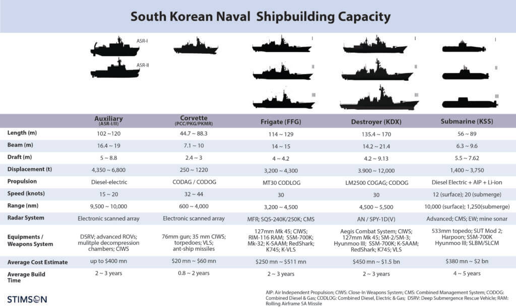The informational graphic shown here provides a look into the capacity of South Korean shipyards in both commercial and naval markets. Many features of the vessel can be customized and varied according to buyer requests; hence, the price and build out times are subject to adjustments. Accordingly, this infographic does not provide a complete picture of all ships that South Korean shipyards can produce. But the summary does provide a reference point to get a sense of South Korea’s shipbuilding capacity.