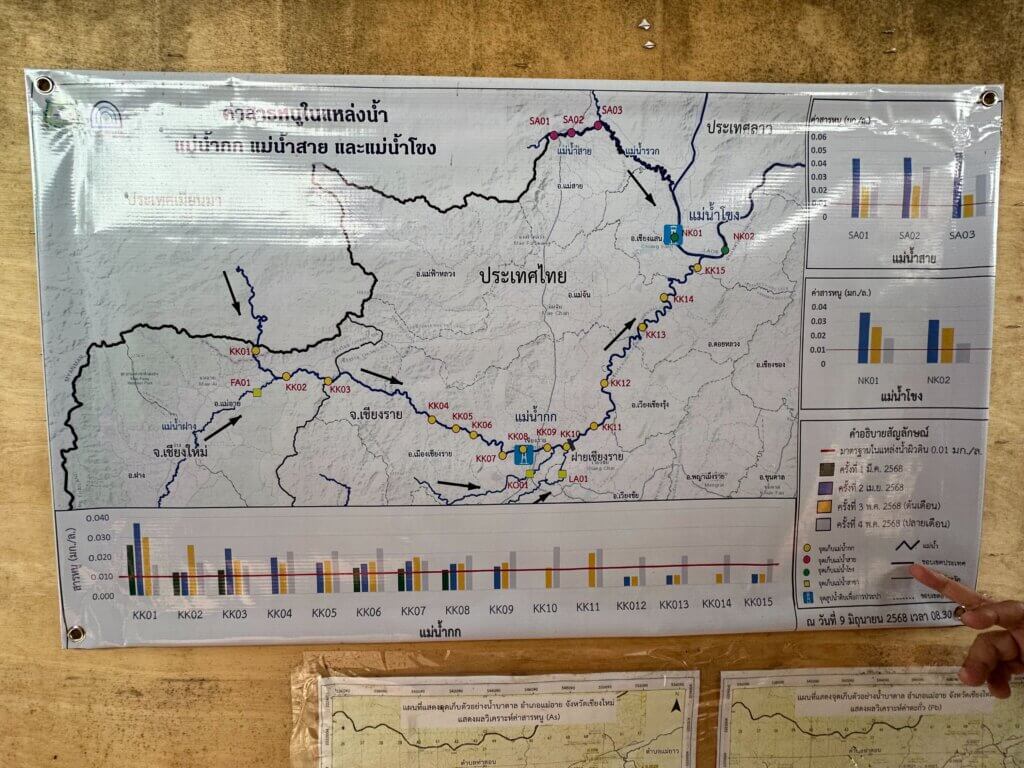 In Thaton, locals complained about skin rashes ranging in their level of severity when coming in contact with the river. Testing results posted in Thaton show toxicity levels vary from month to month at different sites along the Kok. Local people expressed worries about the upcoming 2026 dry seasons, as they need to use the river. For some villages during the dry season, the Kok is the only source of water for consumption and farming. The local government has yet to come up with a solution for the provision of safe drinking water and non-potable water for Thaton subdistrict, thus shifting the cost and anxieties of access to clean water entirely onto the shoulders of local people. Previously, fishing provided both an important source of food and income for local people. Now, according to locals, fishing on the Kok River in Chiang Mai and Chiang Rai provinces has stopped completely. Indeed our team observed zero fishing activity on both the Kok River and the Mekong mainstream when we visited.
