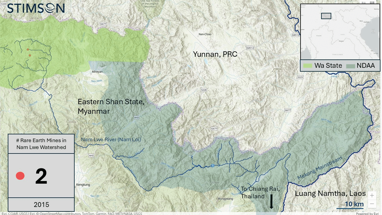 The mines in Myanmar are concentrated in territories administered by ethnic armed groups with close ties to Beijing. These ethnic armed groups often engage in illicit extractive industries or narcotics manufacturing to generate income that supports the administration and defense of their territory. They also at times openly engage in conflict with Myanmar’s central government in a civil war that has persisted for decades. The Nam Lwe (Nam Loi) River, a 200-kilometer long tributary of the Mekong that enters the Mekong mainstream along the Myanmar-Lao border, about 150 kilometers upstream from Chiang Rai, has the highest concentration of rare earth mining in the river basin. Prompted by reports on the recent growth of mines in United Wa State Army and National Democratic Alliance Army (NDAA) territory by Shan Human Rights Foundation, our team used satellite imagery and identified 31 rare earth mines in Wa State near the Nam Lwe headwaters, and 26 mines in NDAA territory farther downstream.