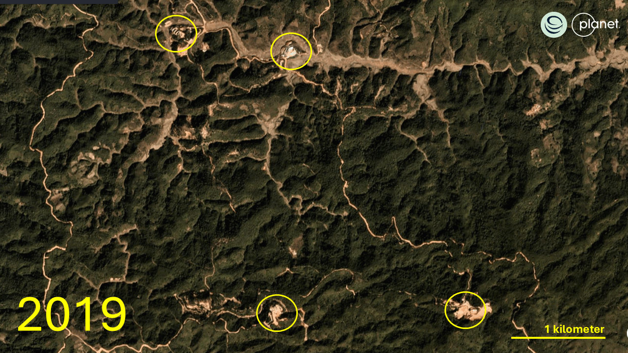 Time series of rare earth mines in the Mekong Basin (Myanmar and Laos) from 2015-2025. Data: Planet Labs, Stimson.