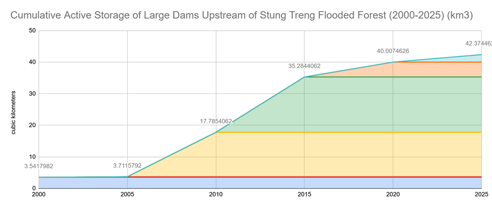 Figure 3: Cumulative Active Storage of Large Dams Upstream of Stung Treng Flooded Forest (Data: Mekong Dam Monitor)