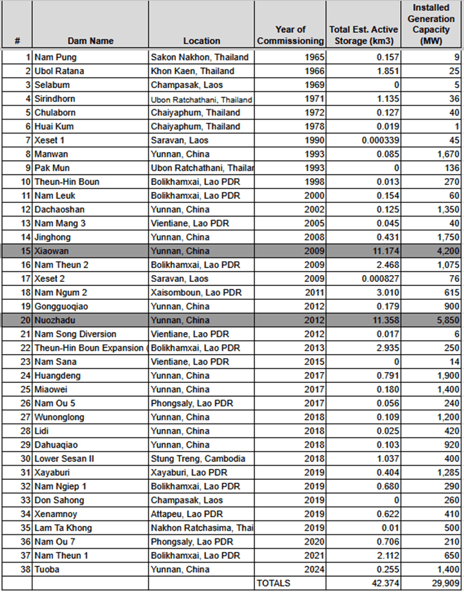 Figure 4: Dams above Pakse ordered by date of completion. (Source: Mekong Dam Monitor)