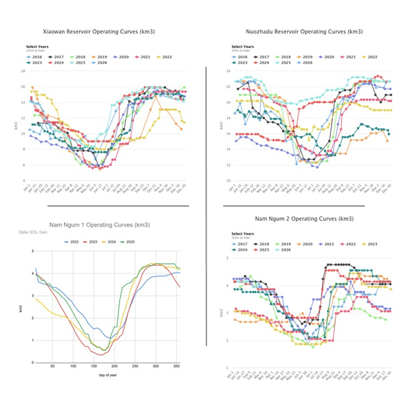 Three of the four operating curves shown in Figure 5 are estimated using Mekong Dam Monitor (MDM) methods (Xiaowan, Nuozhadu, and Nam Ngum 2). Operating data for Nam Ngum 1 are sourced from the EDL‑Gen website. In general, the operating curves show how these dams store water during the wet season (June-November) and release stored water during the dry season to support hydropower generation.