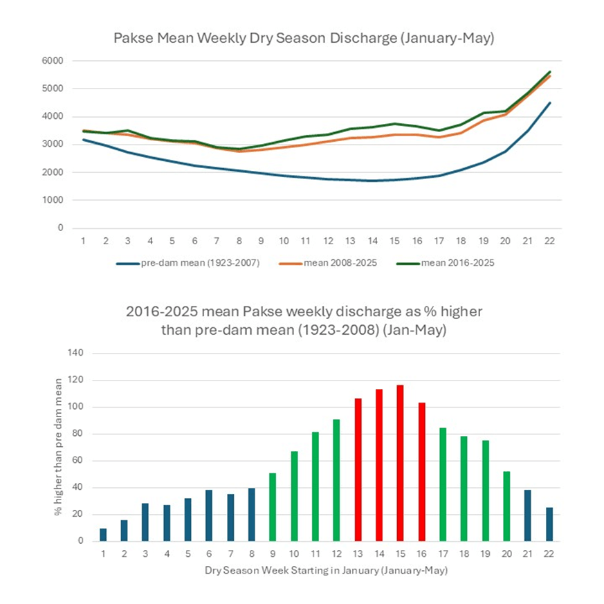 Pakse discharge data confirm this impact. Since 2008, dry‑season discharge has exceeded long‑term historical averages, with the most pronounced deviations occurring between January and May. The seasonal shape of the hydrograph has also changed: The lowest river levels now occur earlier in the dry season, typically in February, rather than in March or April as before. Instead of gradually declining through the dry season, discharge rises sharply during months that were once characterized by low and stable flows. For 12 weeks (roughly end of February through May), discharge at Pakse is more than 150% above the pre-dam mean, and for four of those weeks (roughly end of March through mid-April), discharge is greater than 200% of the pre-dam mean.