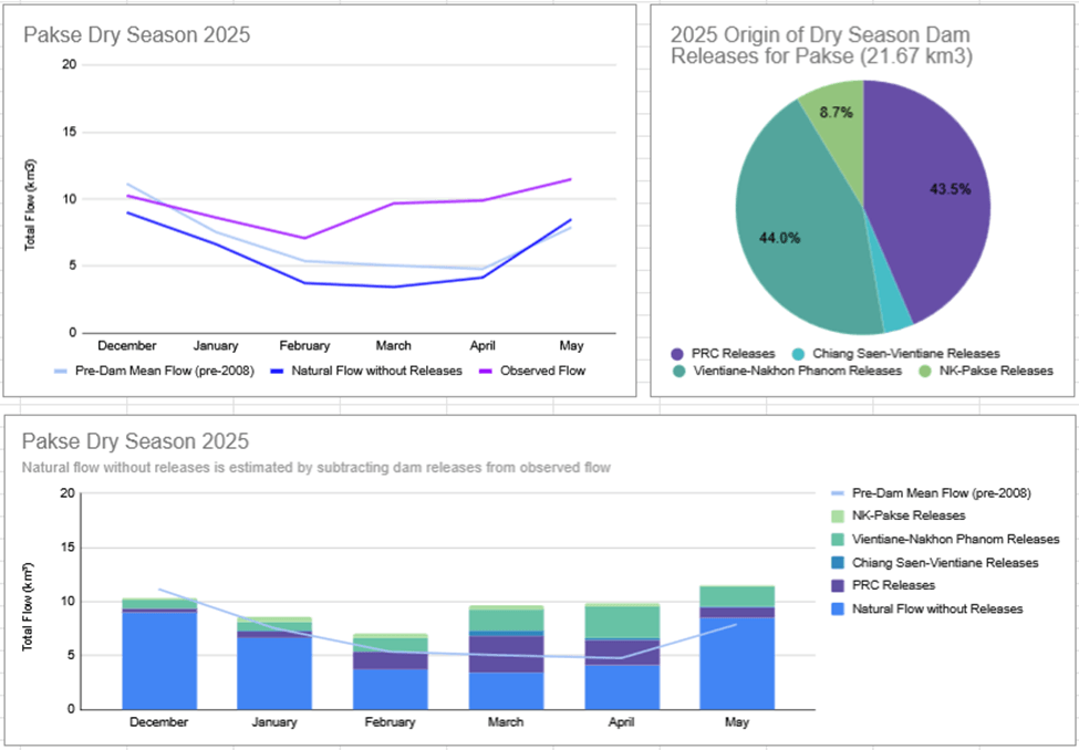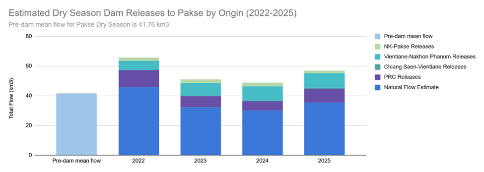 Estimated reservoir releases from upstream dams were aggregated and lagged to approximate the timing of their arrival at Pakse during the dry season. Figure 8 provides evidence that the hydrological alteration observed at the Pakse gauge is a result of upstream dam releases. Cumulative releases were grouped geographically: China (purple), central Laos (teal), and Thailand’s dams (green). By subtracting estimated dam releases from observed discharge, counterfactual cumulative natural flow estimates for the 2022-2025 dry seasons were derived.