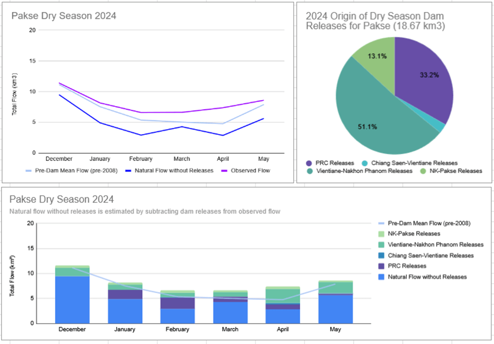2024’s dry season analysis is similar to 2023. Under natural flow conditions, 2023 dry season discharge would have been lower than the long-term pre-dam average for all months during the dry season. Dam releases above Pakse significantly lifted the river level above the long-term average particularly from February to April. In February, observed flow was 122% of the pre-dam average, in March 132%, and April 154%. So even in relatively low flow years for the river (under natural conditions) dam releases can significantly increase flow to well above the pre-dam average.