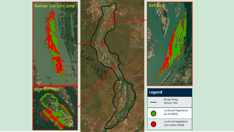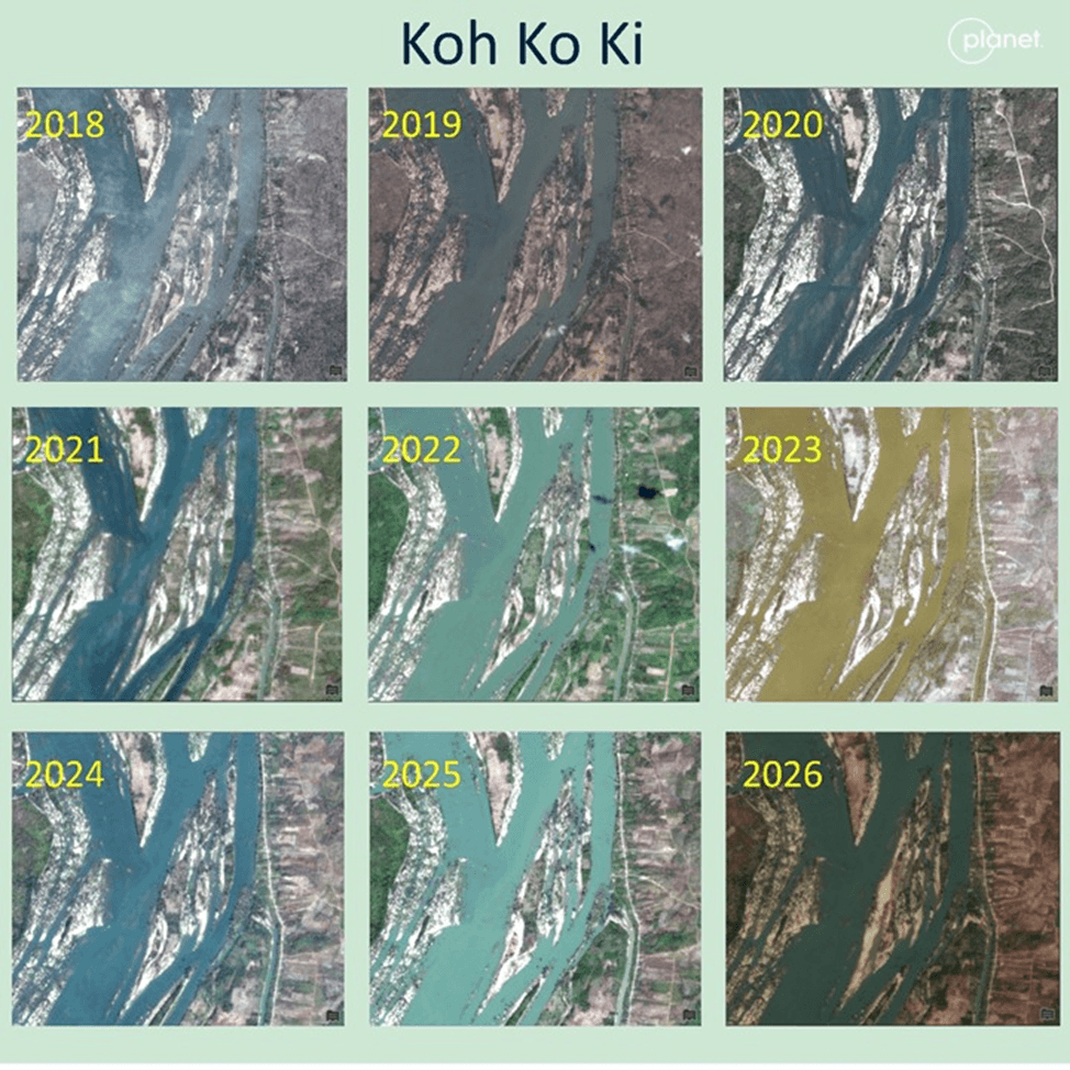 Koh Ko Ki is one of the largest islands near the upper boundary of the STRS, and according to community interviews, this island and its neighboring smaller islands have been used for farming since the 1960s. Between 2018 and 2026, the island and nearby vegetation experienced a 35% loss in area, or 62 hectares (Figure 12). Early losses occurred gradually along the island’s margins, particularly at the northern tip and southwestern edge. Between 2024 and 2026, the western half of the island eroded dramatically. This loss was driven by extreme river conditions during the wet season, but the island had been progressively weakened over preceding decades by persistently high dry-season water levels. Those sustained dry-season conditions slowly killed riparian trees and shrubs that once stabilized the banks, leaving sandbars and riverbanks exposed to the full force of wet-season flows.