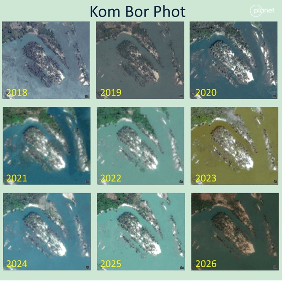 The final spotlighted area focuses on an unnamed island in the Kom Bor Phot area immediately south of Koh Hib island. This area is similar to the Ramsar Site Core Zone in terms of seasonal inundation: During the wet season the island is submerged with only trees appearing above water. Analysis of this area shows a steadily sharp decline in land and vegetation from 2018 to 2026. Much of this loss comprises riparian vegetation die-offs around and within the island and scouring and erosion of loosened or exposed sediment.