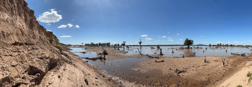 During the 2024 wet season, a substantial portion of the island’s western half collapsed, leaving a newly formed sandbar and isolating riparian trees and shrubs that had once defined the riverbank. Erosion continued into the subsequent dry season, and, as reported by community members during a field visit and confirmed by satellite imagery, the southern half of the island also collapsed. The newly exposed areas then separated and washed away, stripping most of the remaining vegetation and leaving only a few small clusters of trees where the original riverbank once stood.