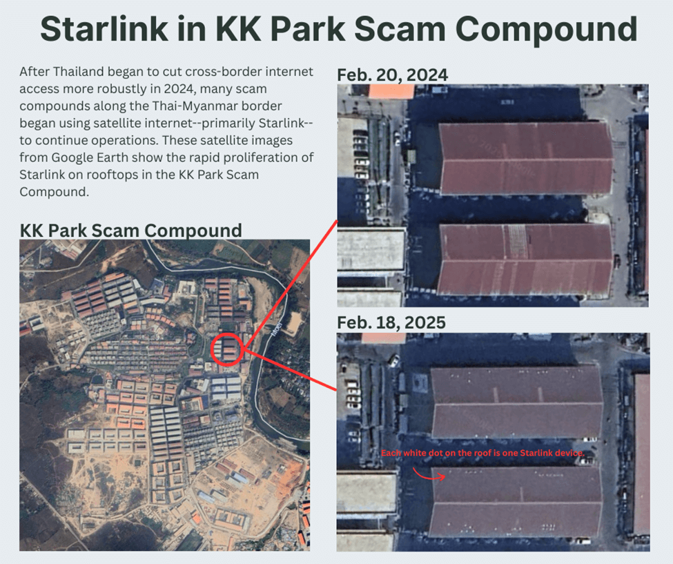 Starlink usage is a typical example of how criminal actors bypass efforts to shut down their operations. Given the infrastructural challenges in Myanmar, it’s been known for years that scam centers located along the Thai-Myanmar border were hooking into services provided by Thailand through mobile data, cross-border electricity connections, and cross-border internet connections. Thailand began cracking down on this as public attention to scam centers rose: In May 2024, Thailand’s National Broadcasting Telecommunications Commission began reviewing mobile towers along the border in an attempt to ensure they were readjusted to avoid providing services across the national border. In February 2025, in response to public concerns about scam centers utilizing Thai power and internet access to run criminal operations, Thailand cut cross-border internet access to five key zones hosting scam centers. Thai investigations occasionally identify surges in internet use that have been tied to illegal cross-border cables to areas with scam compounds, prompting further action and ongoing policing efforts. While the use of alternative satellite internet predates these cutoffs — an investigative deep-dive published just after Thai actions indicated that Starlink was already widely observed in these compounds by February — interviews indicated that their expanded use coincided with loss of access to internet through traditional means.
